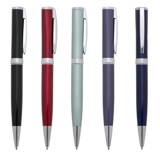 Descrição: Caneta metálica com carga esferográfica azul e acionamento por rotação.