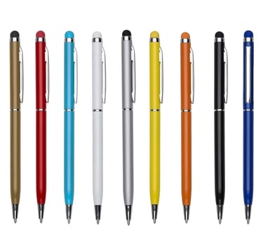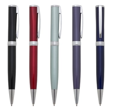 Descrição: Caneta metálica com touch screen, carga esferográfica azul e acionamento por rotação.