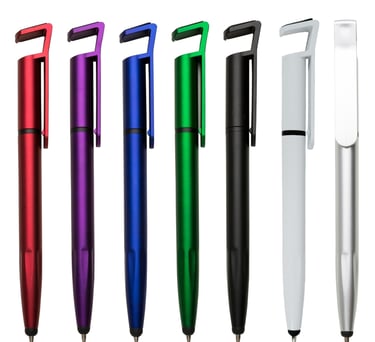 Descrição: Caneta plástica com suporte para celular, ponteira touch screen e limpador de tela. Carga esferográfica azul e acionamento por rotação.
