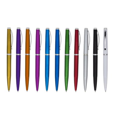 Descrição: Caneta plástica com carga esferográfica azul e acionamento por clique.