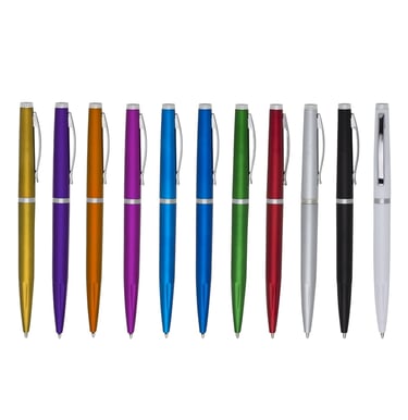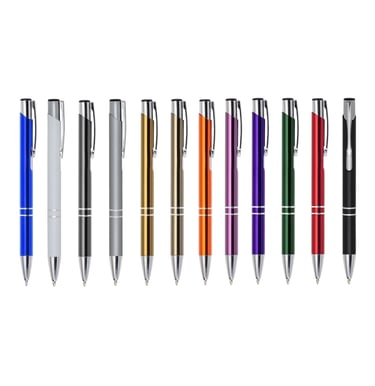 Descrição: Caneta metálica com carga esferográfica azul e acionamento por clique.