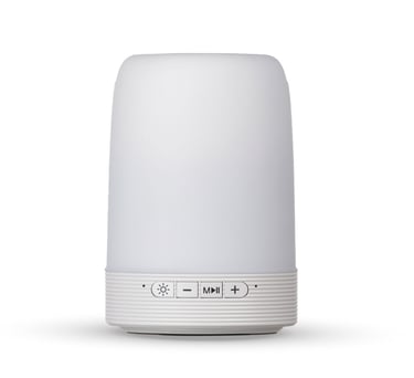 Descrição: Caixa de som multimídia com luzes, suporte para celular e porta caneta. Material plástico resistente na cor branca fosca, parte superior com falante vazado na área interna, pode ser utilizado como porta caneta ou suporte para celular. Parte inferior branca leitosa com linhas em relevo, borracha inferior anti deslizante e alça de alumínio.